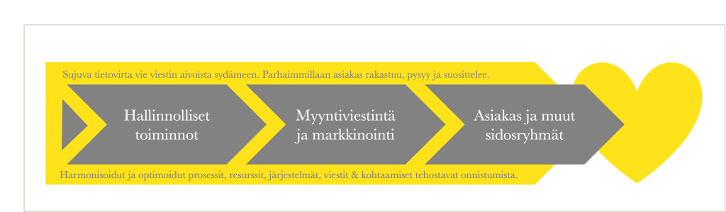 Tietovirran eheytyminen, laadun, sisällön ja tehokkuuden optimoinnin avulla parantaa kannattavuutta ja lisää työ- ja asiakastyytyväisyyttä. Sujuva tietovirta toimii kuin aivojen hermoimpulssi. Oikein kanavoitu virta vie viestin aivoista sydämeen ja asiakas rakastuu. Tyytyväinen asiakas pysyy ja suosittelee.